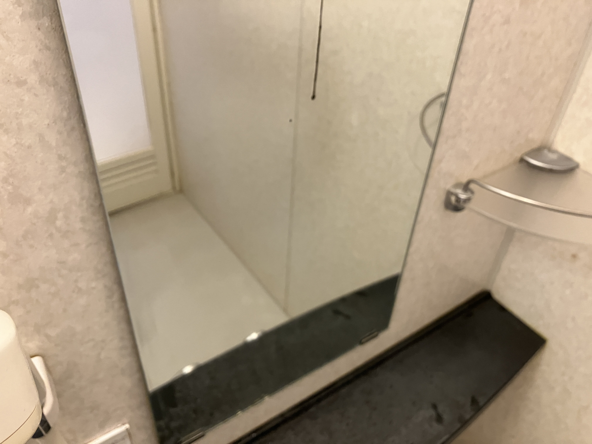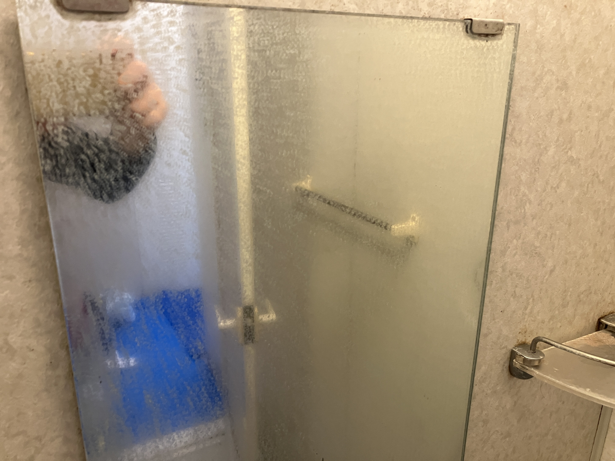 ほとんどの浴室で鏡はシャワーの横や裏側に設置されていますので、シャワーの水が反射してかかってしまいます、その為皮脂よごれ、金属石鹼カス汚れ、水垢汚れなどスポンジで擦っても落ちない頑固な汚れがついてしまいます。