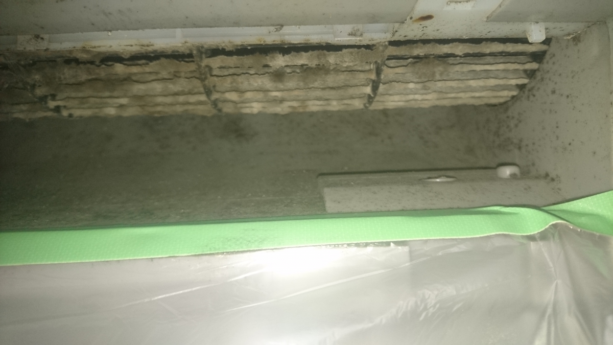 これは今回清掃したものではないのですが、ドレンパンと呼ばれるアルミの部分(熱交換器)から滴ってくる結露をここで受けて、外に排出します。この部分の先はドレンホースというものになっていて、そこを通って外に排出されるのですが、そこがカビや埃などの固形物で詰まると溜まった結露が外に排出されずに、部屋の内部に返ってきて水漏れになります。これが水漏れの原因としては一番多いと思います。この場合は中のつまりを直せばいいので、清掃することで水漏れの改善が可能です。