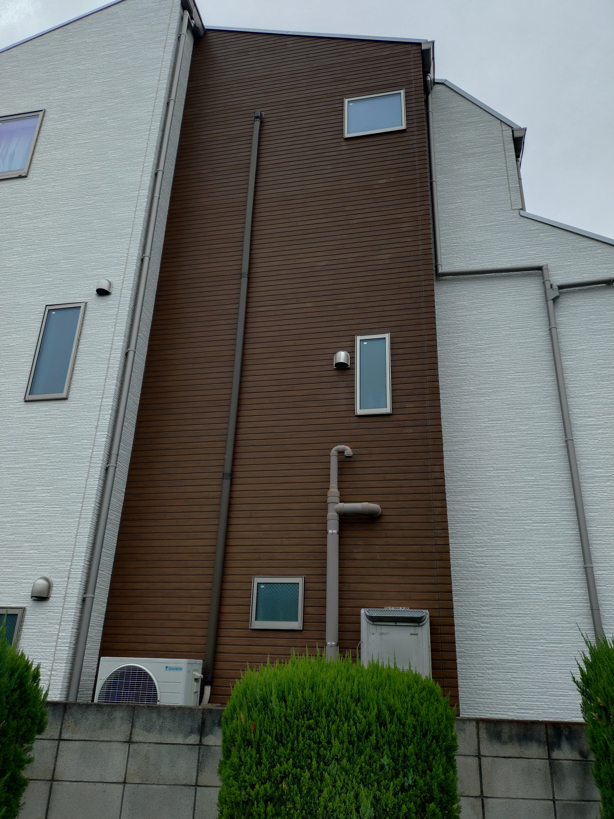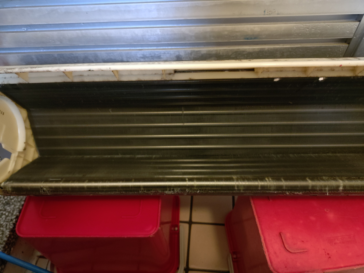 写真のイメージだと3階から1階の室外機に向けて、配管が出ています。室内機を分離する部分は3階のあたりについており、ここを分解するには高所作業が必要になります。去年の話では危険作業なのでこの場合は作業していませんでしたが、その後背抜き完全分解クリーニングという手法を勉強してこちらも出来るようなったため両方を用いて完全分解清掃します。どちらもそれぞれ分解出来ない場合がありますので、両方の分解方法をとる事で多くのエアコンが完全分解できるようになりました。