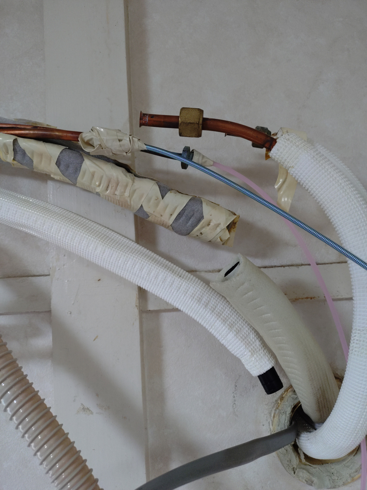 色々と断熱してあったりテープで覆われているのですが、それらを外すと画像のような配管接続部分が見えます。写真左側の配管が補助配管と呼ばれる室内機から出ている配管になり右側の部分が室外機につながる配管になります。これらをモンキーレンチで2丁がけして外します。