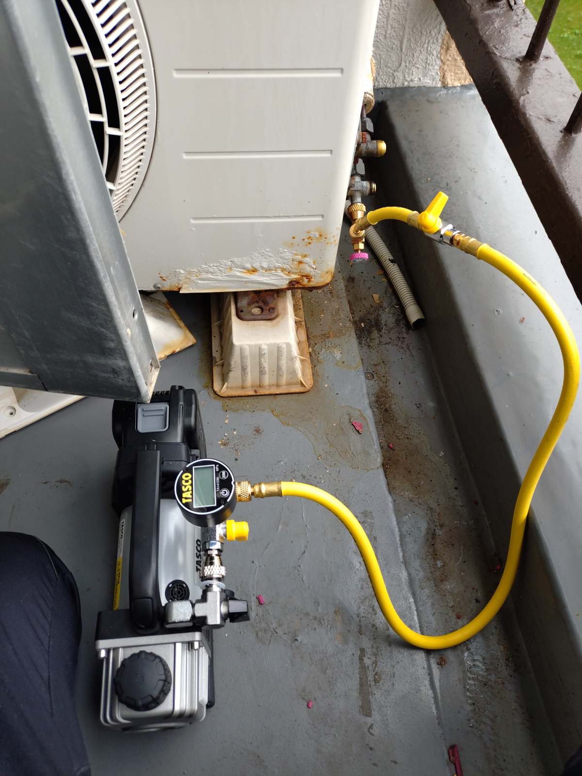 配管を接続してこれから室外機にため込んだガスを配管に戻していくのですが、配管に空気が入っているため接続した配管と室内機を真空引きしていきます。