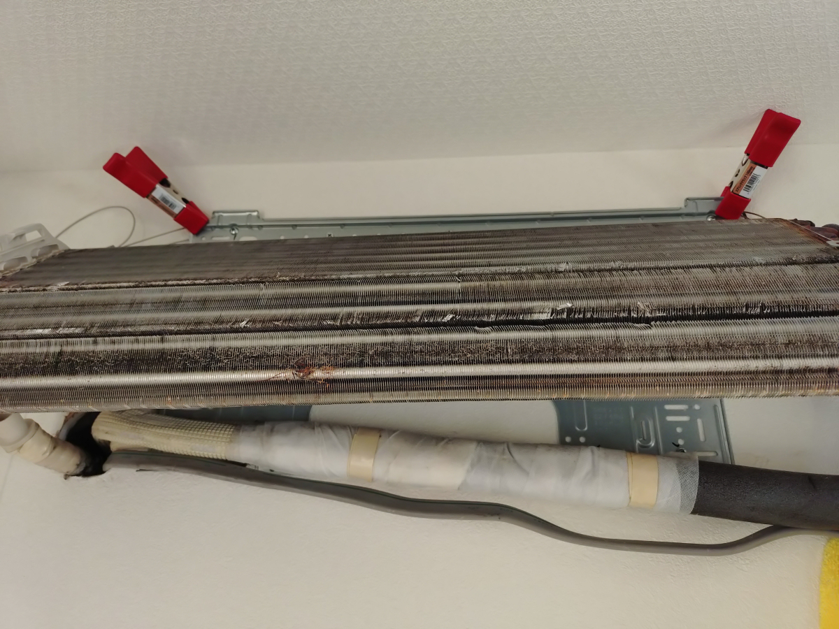 着脱完全分解清掃は分解自体は床に下して分解するためある程度やりやすい状態で作業出来ますが、他の方法と違ってエアコン取付の道具や配管テープ等が必要になってきますし、取り外すために配管接続部分をやり直したりする必要があるため更にひと手間かかります。