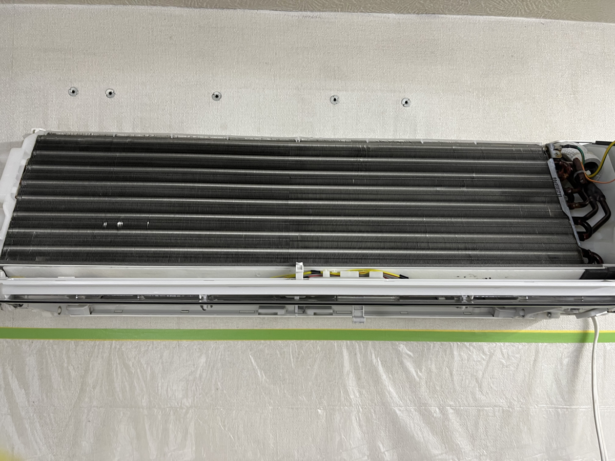 特にこのメーカーのエアコンに多いのですが、フィルターを越えて熱交換器にもホコリがこんなに積もっています(T_T)
