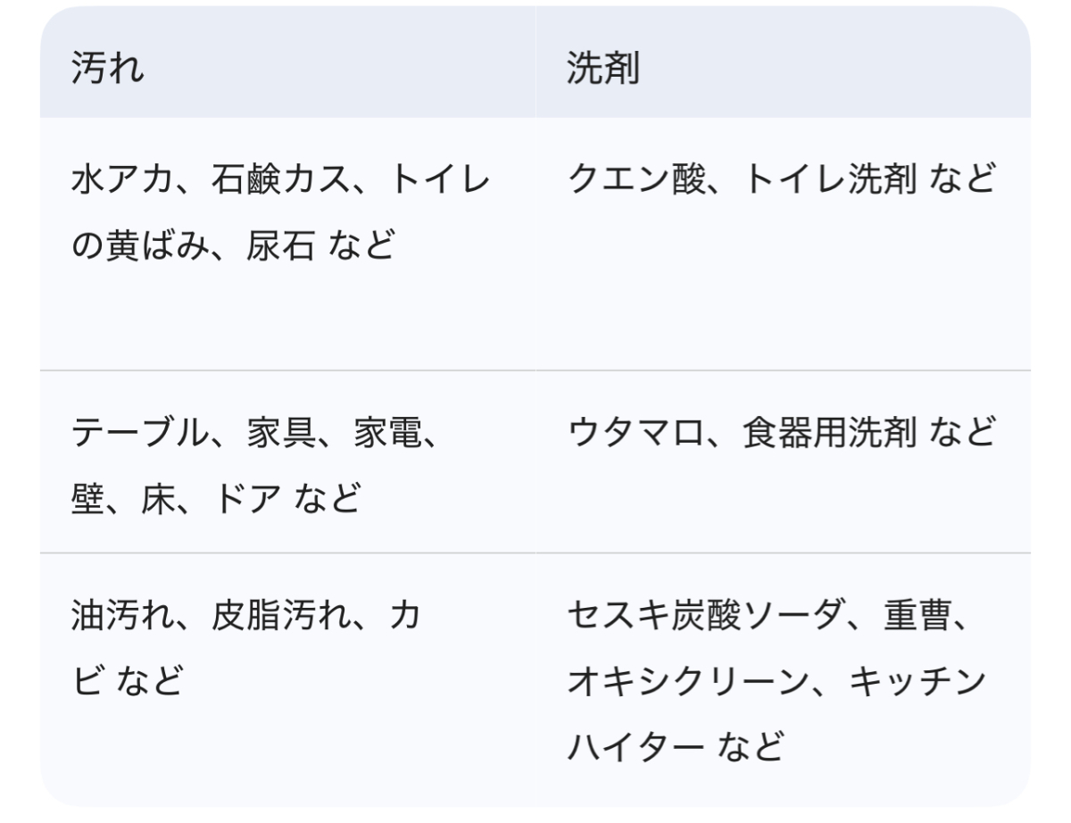 ※ 中性洗剤(ウタマロ、食器用洗剤など)は、軽い汚れや日常的な掃除に幅広く使え、素材への影響が少ないのが特徴です。