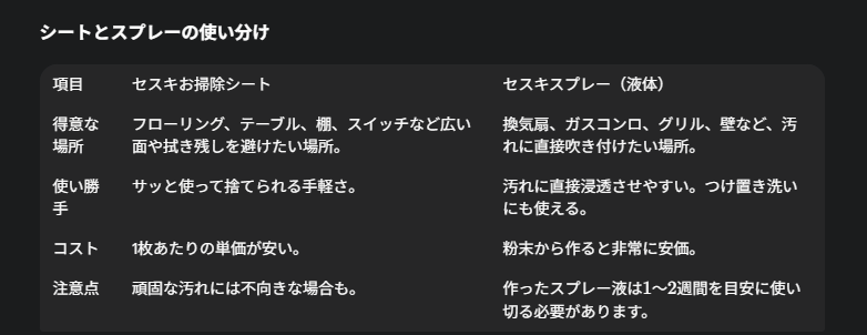 スプレー(液体)は、キッチンコンロ周りや換気扇など、油汚れに直接吹き付けて浸透させたいときや、部分的な汚れのつけ置きをしたいときに役立ちます。