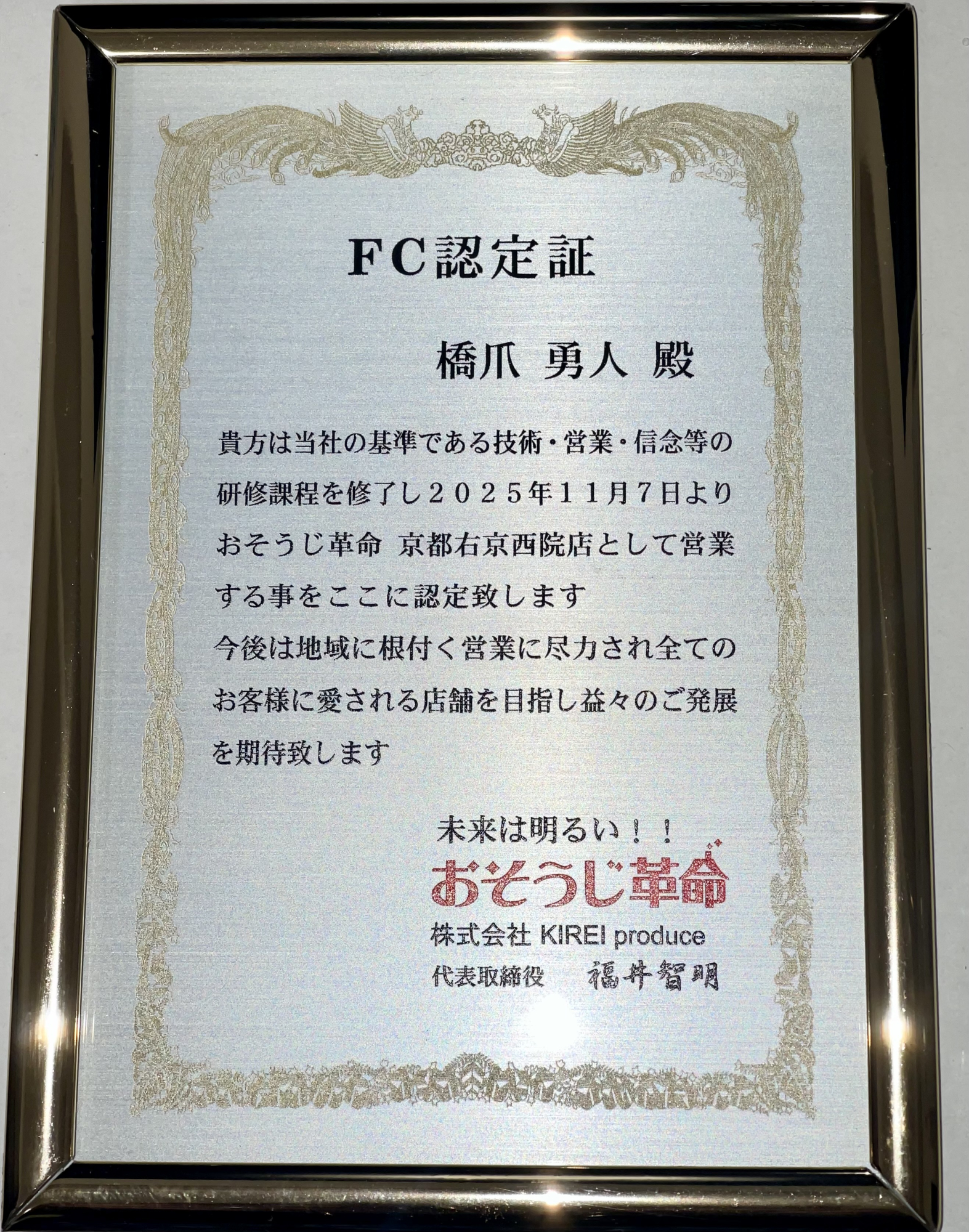 【おそうじ革命京都右京西院店11月17日オープン】本日認定式!!