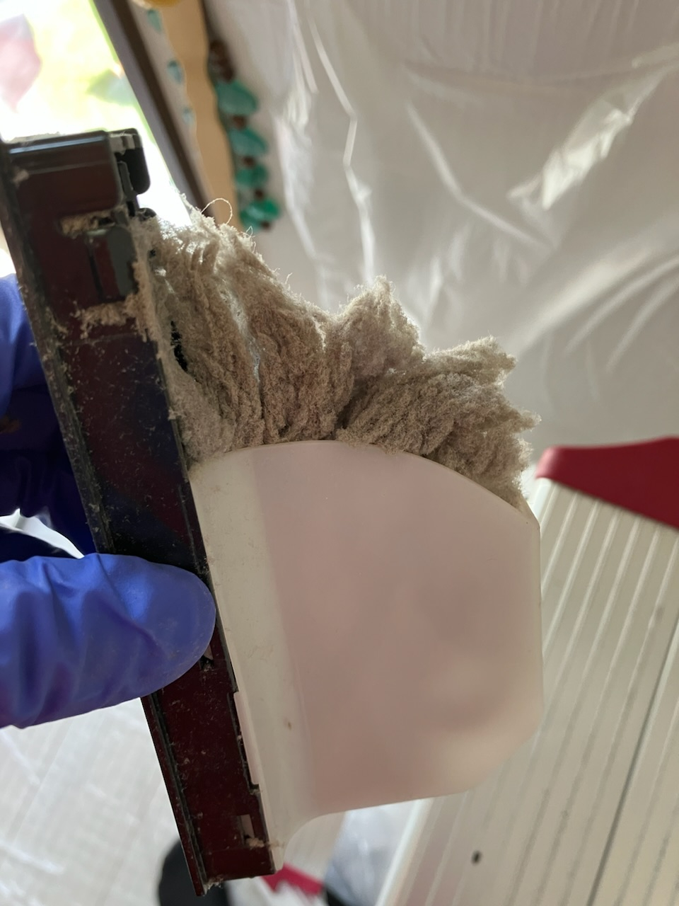 お客様に状況を説明させていただき早めの修理依頼をご提案したところ、早速ご連絡していただけ、洗浄に作業に入ることが出来ました。フィルターが詰まっていたせいでエアコン内部のありとあらゆるところに埃が入り込んでいたので、こちらもしっかりと掃除させていただきました。