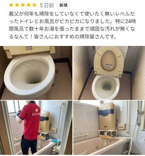 評価★★★★★ 義父が何年も掃除をしていなくて使いたく無いレベルだったトイレとお風呂がピカピカになりました。 特に24時間風呂で数十年お湯を張ったままで頑固な汚れが無くなるなんて! ...