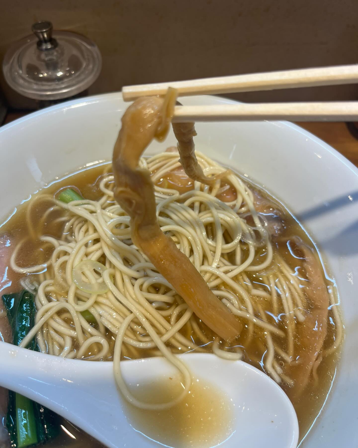 青森のテイストよりも煮干し濃くない自家製らしい細パッツン麺、途中青菜の苦みが心地よくメンマは自家製太麺渡辺ライクでした。