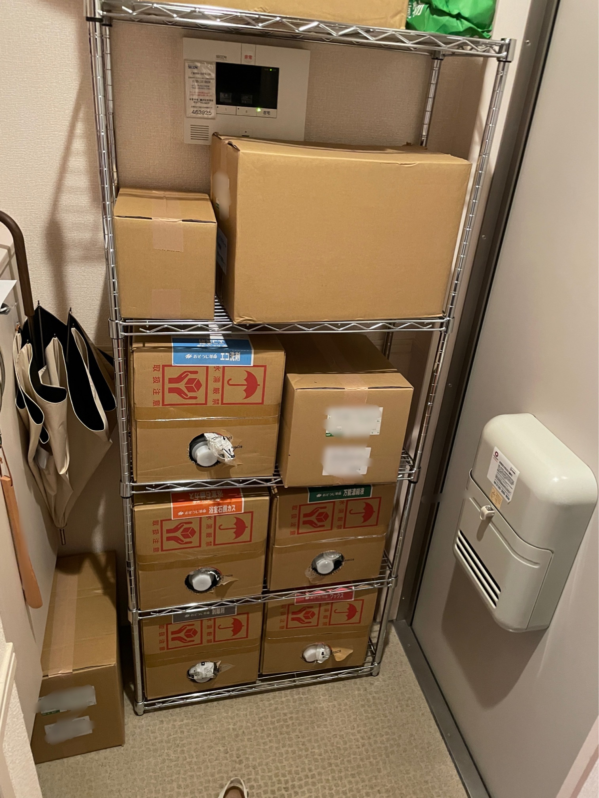 そして事前に組んでおいたラックに段ボールたちを入れて、なんとか洗剤の搬入完了٩( ᐛ )و