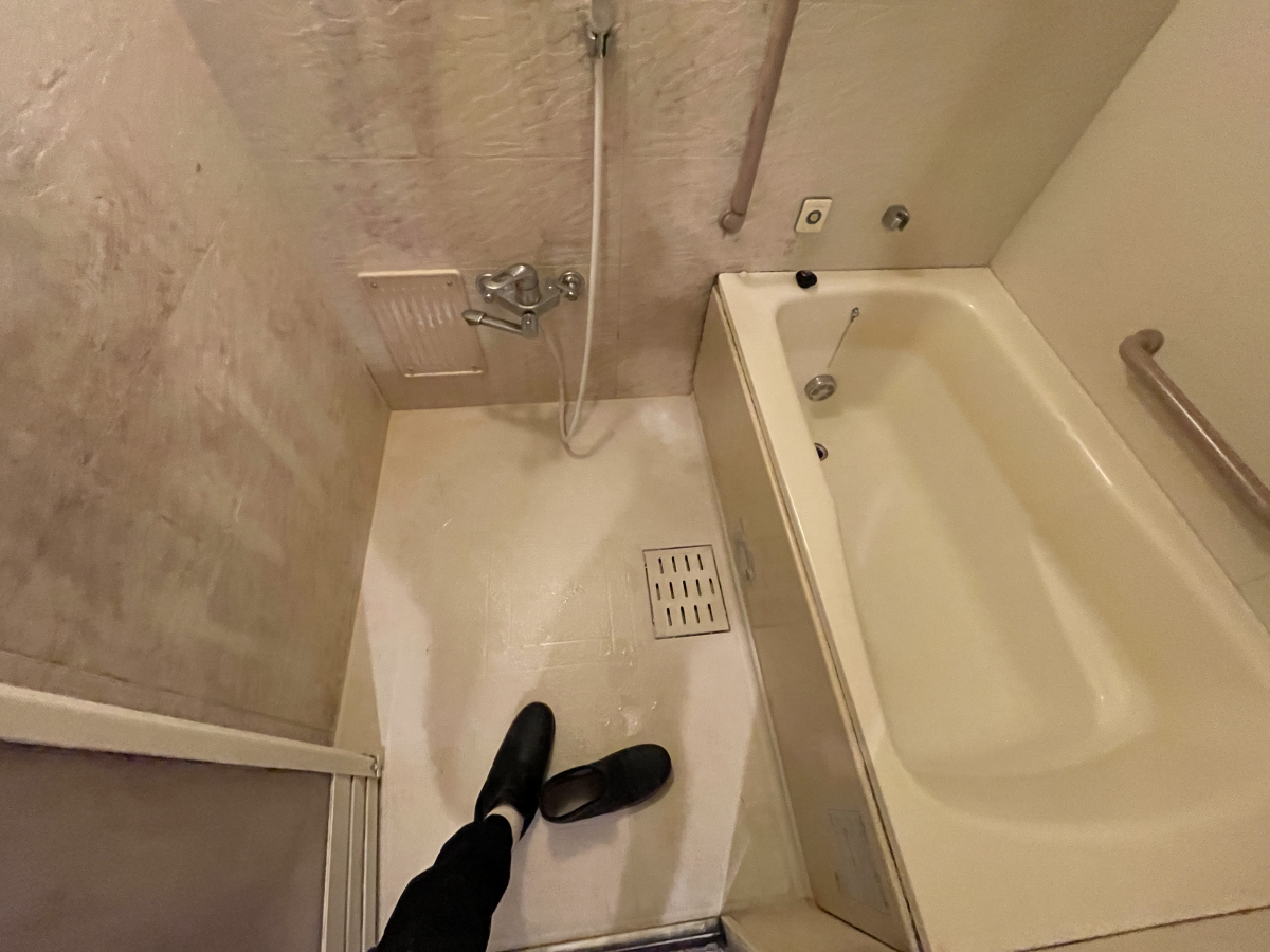 浴室全体に洗剤を塗り、つけ置いたのち、洗剤残りのないようしっかりと水で流していきます。