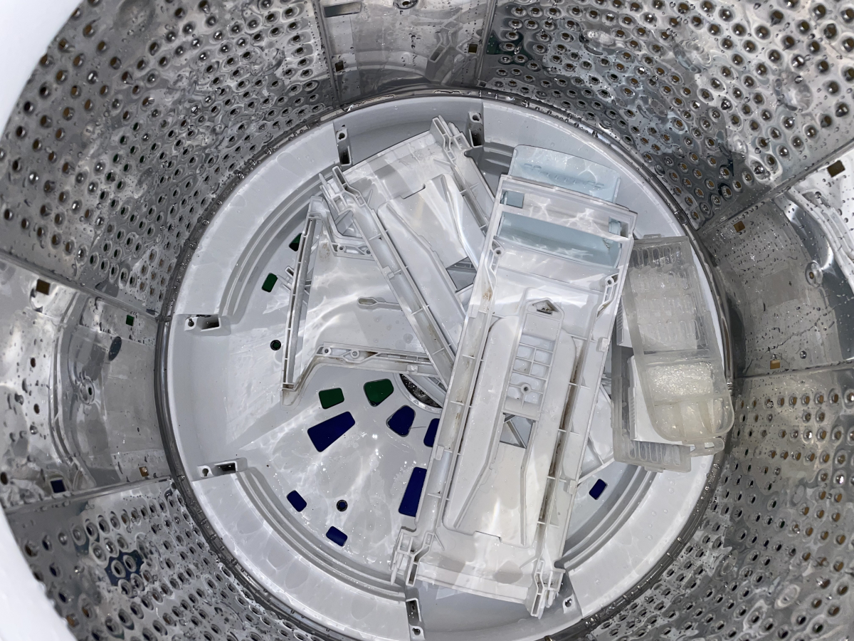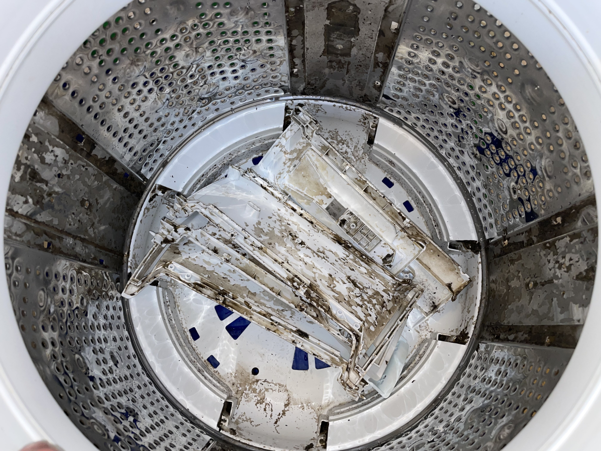 表面上はキレイに見える洗濯機でも、分解してみると内部にはカビや洗剤カスがびっしり…。