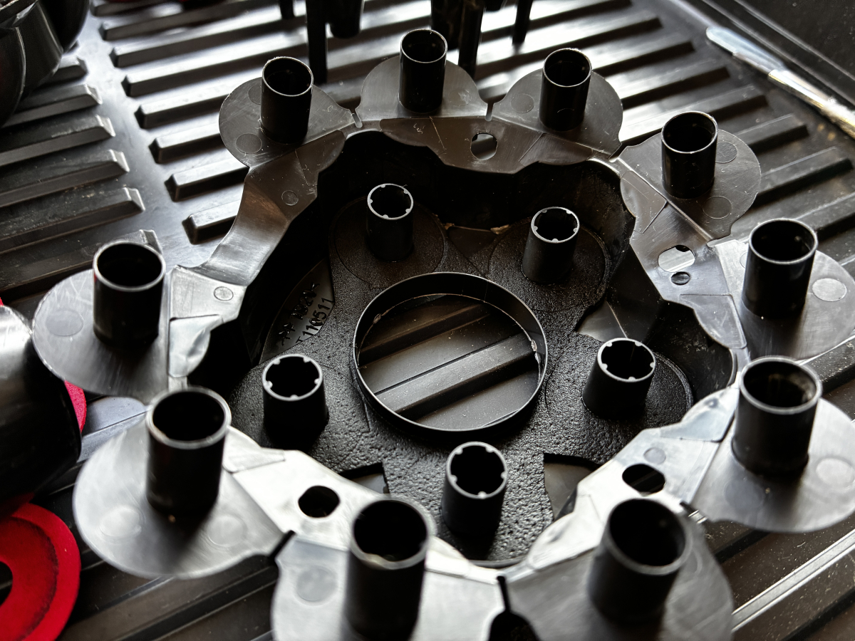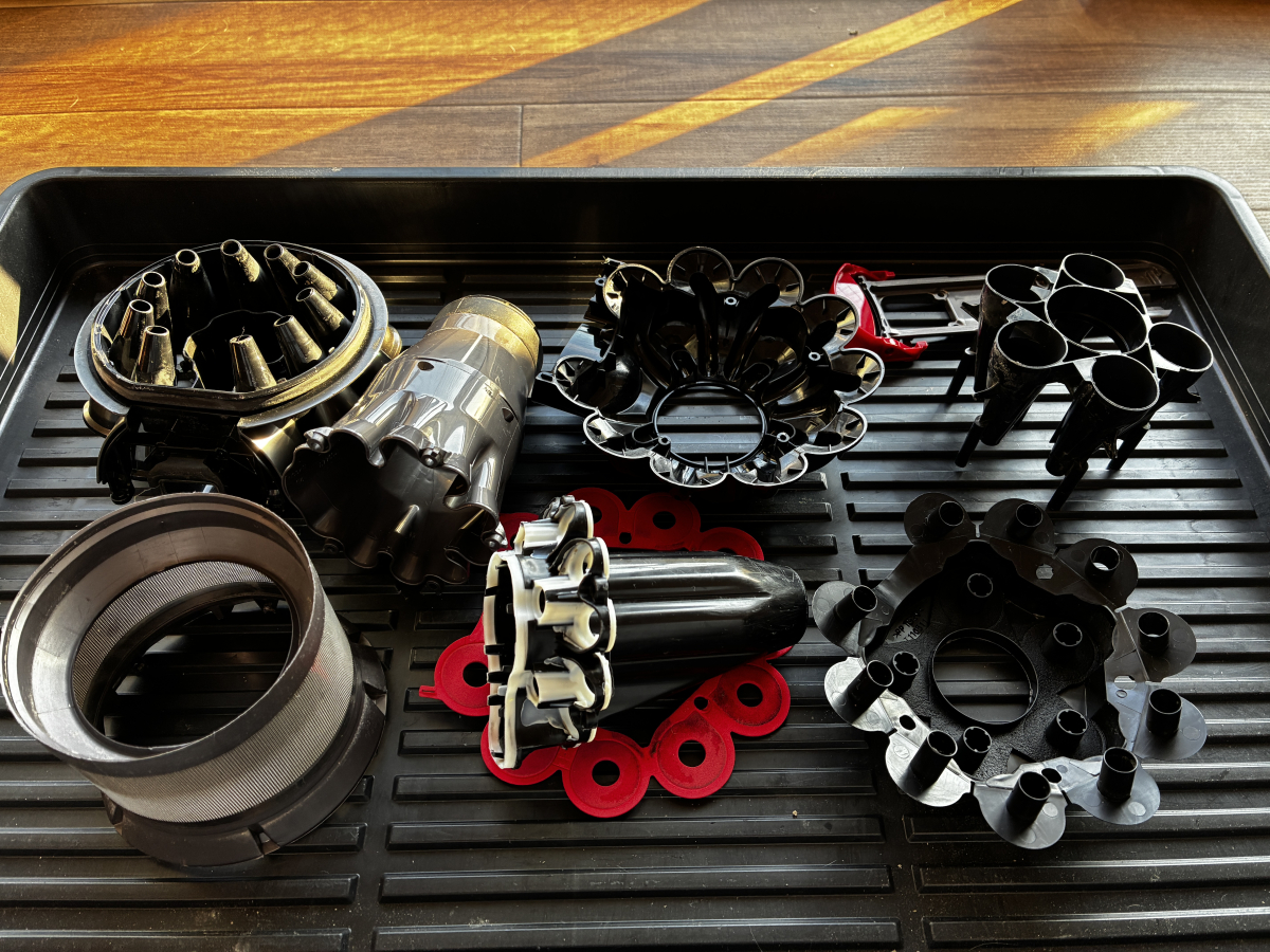 サイクロン部分を分解していくと、こんなにも多くのパーツが内部に組み込まれております。