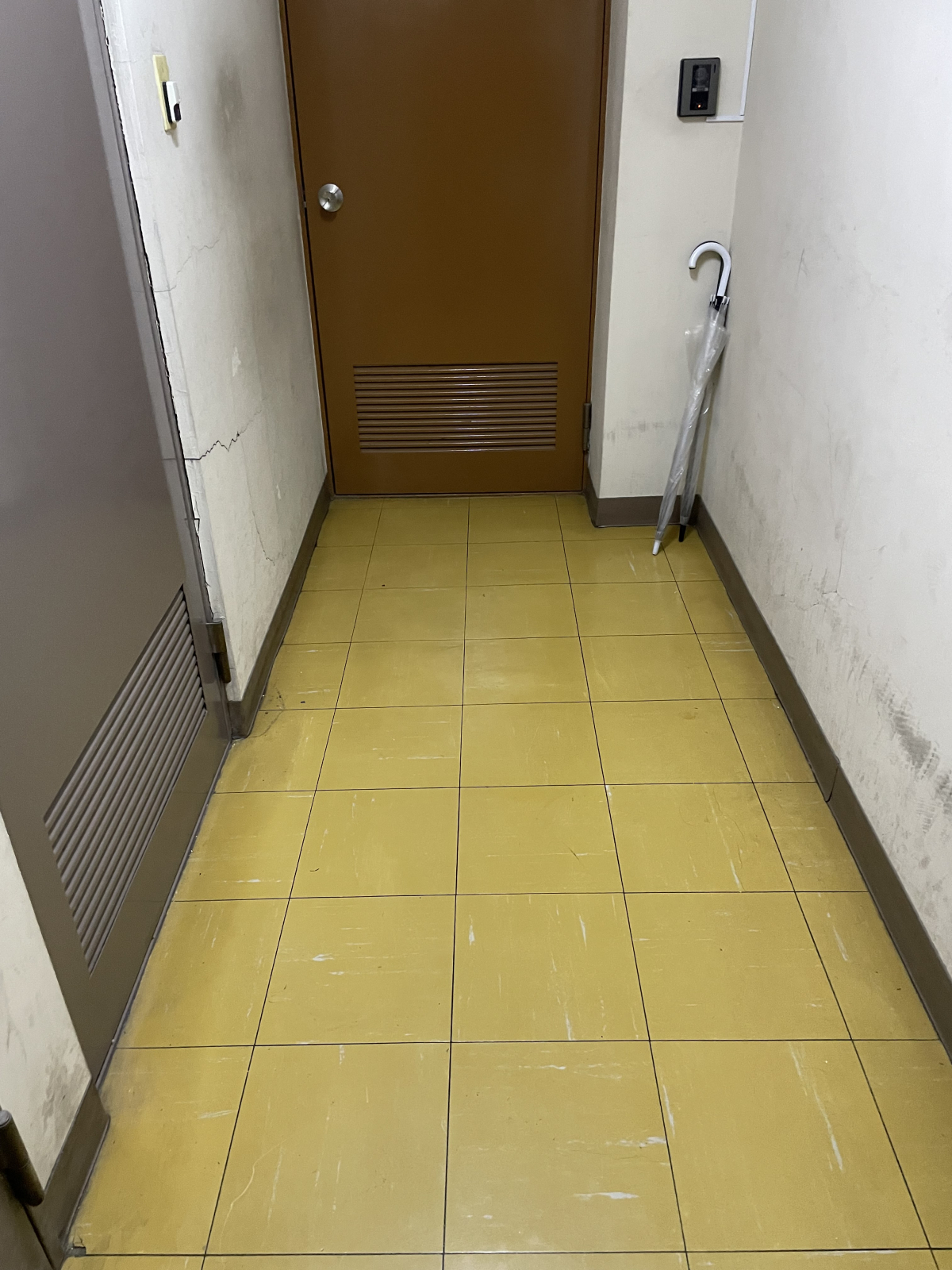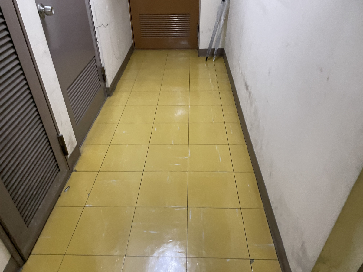 本日のOJT研修は、浅草の10階建てマンションで実施。8人が2チームに分かれ、私は1〜5階の廊下・階段・出入口を担当しました。ポリッシャーでの床洗浄後、ワックスを丁寧に塗布し、清潔で光沢のある仕上がりに整いました。現場では段取りの重要性を実感し、チーム全体で声を掛け合いながら効率よく作業できました。講師の方からは「床掃除はチームワークとお客様目線が大切」という言葉をいただき、単なる清掃ではなく、快適な空間づくりを意識することの大切さを学びました。作業を通して、清掃の奥深さとプロとしての心構えを学んだ一日でした。
