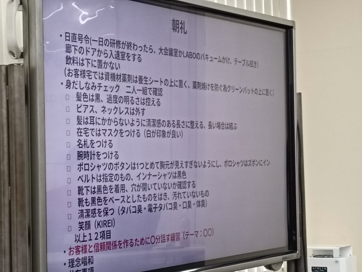 今日は最後の講義日として、「本部理解」から始まり、会議室・ラボの清掃、そして開業後のサポート講話まで盛りだくさんの一日でした。