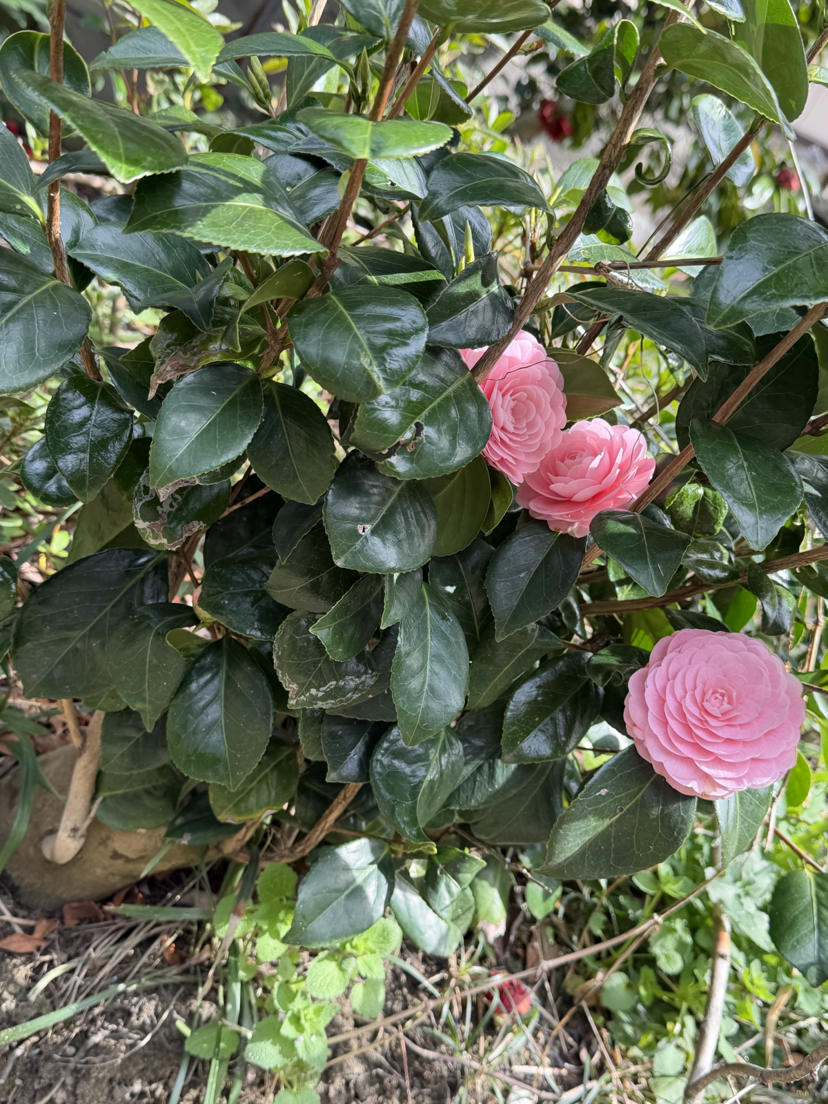 裏庭を探索していると…赤色とピンク色の椿が咲いていました♪
