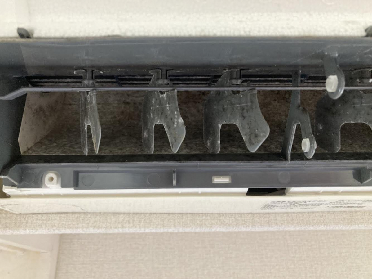 アルミフィンと呼ばれる熱交換器の部分にはホコリが詰まってしまっています。吹き出し口にはカビがワンサカ。ここから出る空気を吸っていたら病気になってしまいそうですね。