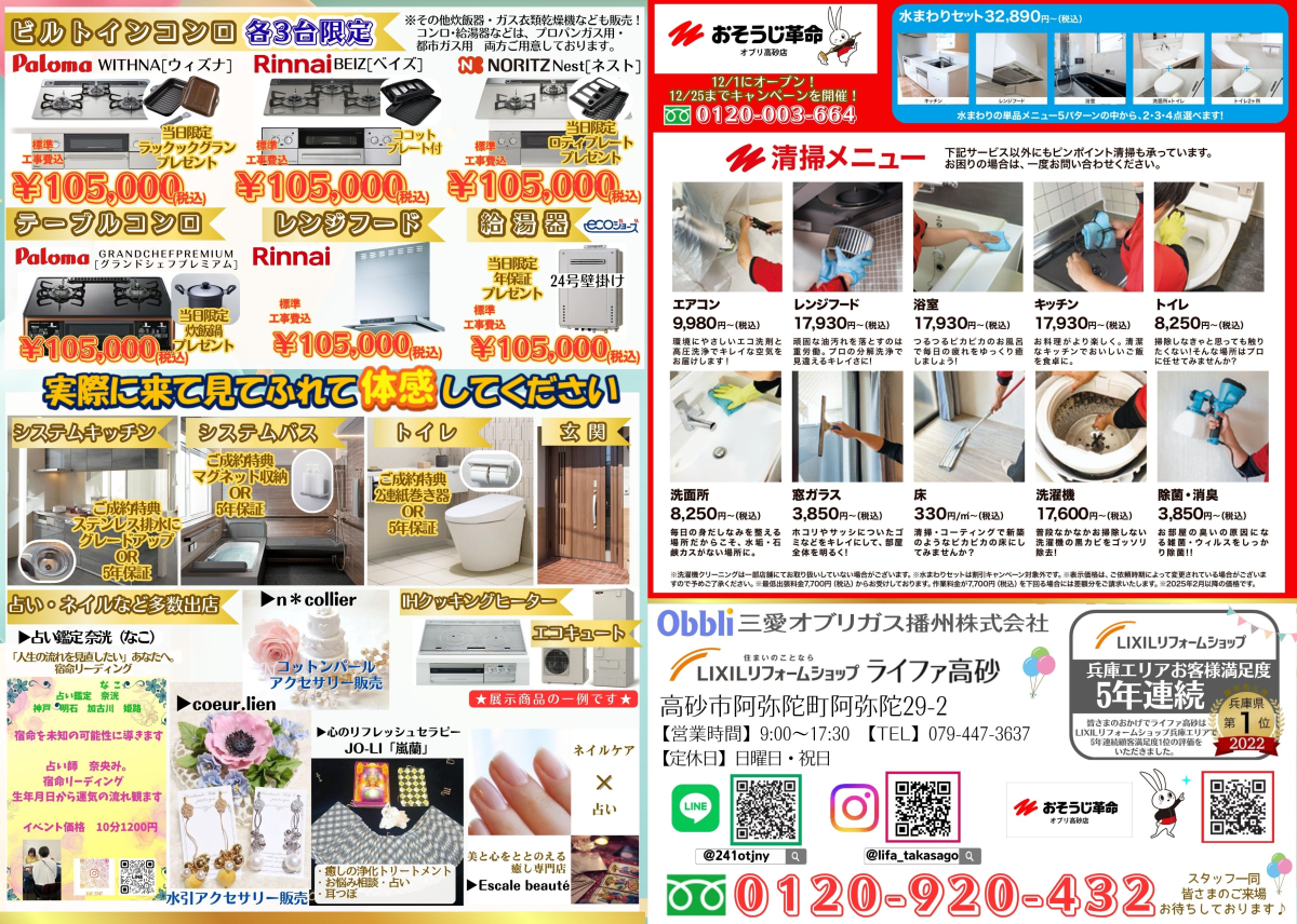 ガス機器の展示やリフォームの相談会とともに今回はおそうじ革命オブリ高砂店のオープン記念イベントとしてエアコンクリーニング実演会を実施します!