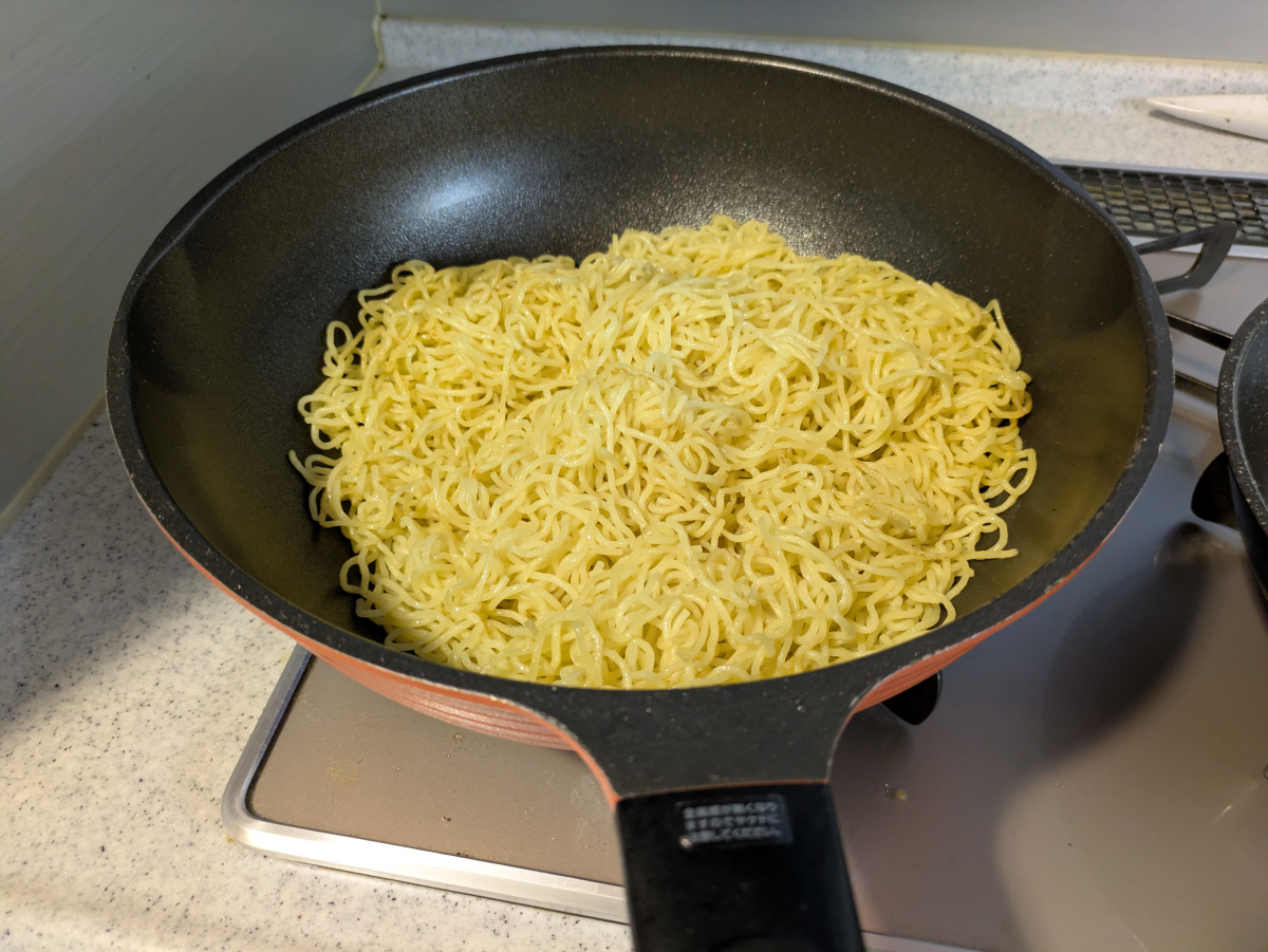焼きそばの食感を残すため、麺がカリッとするまで炒めます