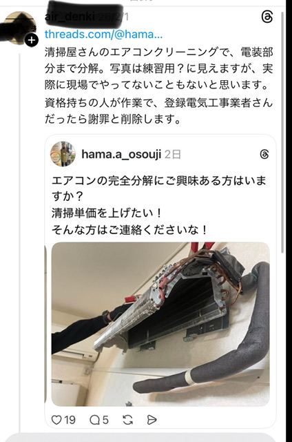 「HPで更新しているとおり、私は電気工事の資格のいらない一般分解のエアコンクリーニングしかしてませんよ」