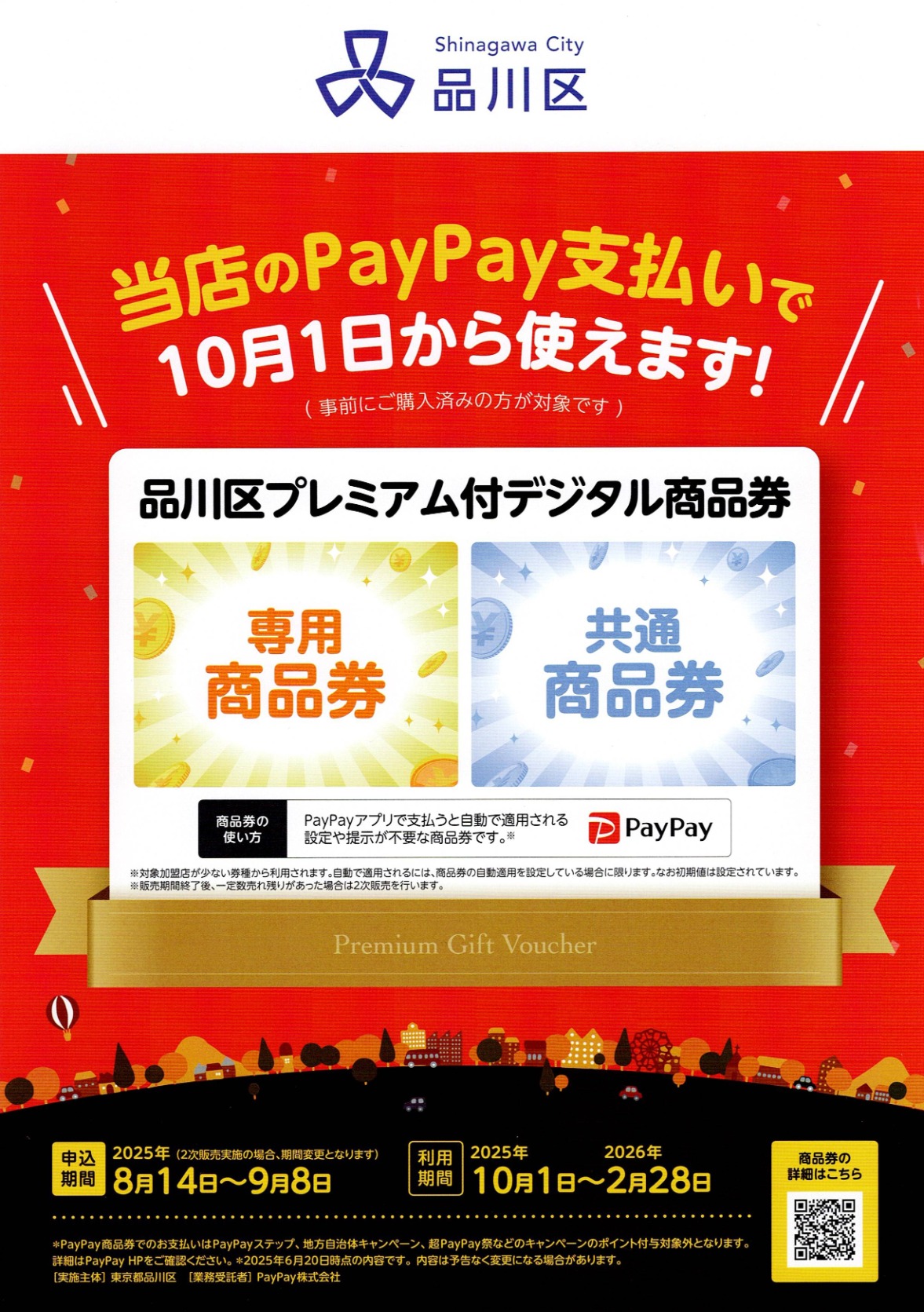このたび、**「品川区プレミアム付デジタル商品券」**が、当店のお支払いにもご利用いただけるようになりました!