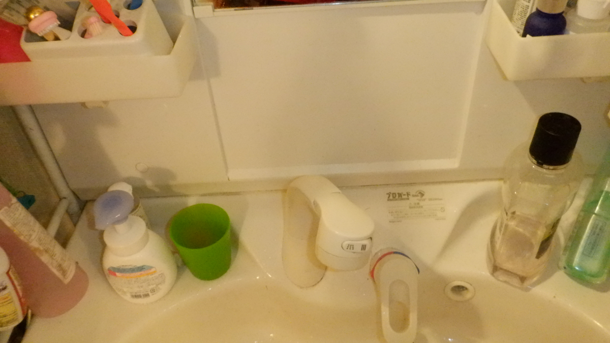 水垢や石鹸カスが残り、汚れやすい洗面所。