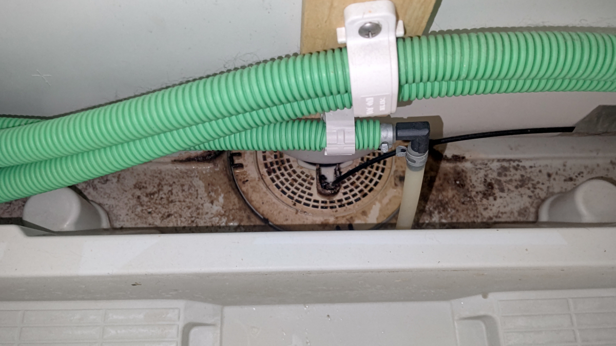 今回気になったのが作動停止の状態の時ファンの上の排気口が開きっぱなしになり、外からの排気ガスが中に入ってくる。だからファンの汚水が黒いのです。