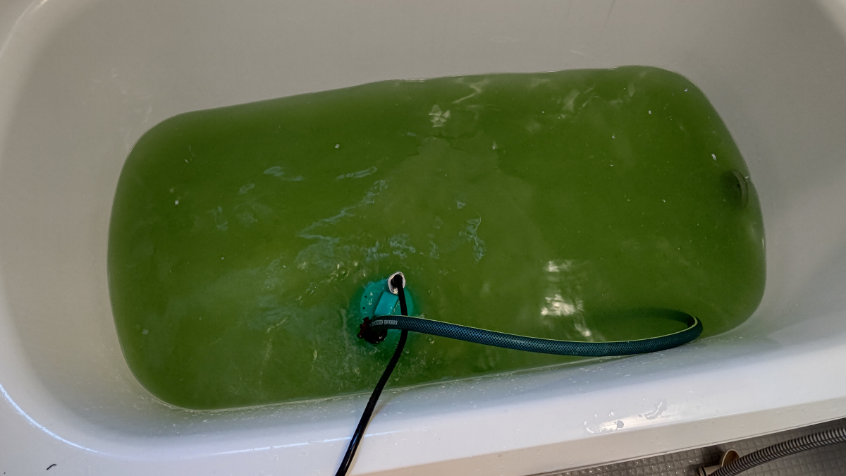 ↑はマイクロバブルを発生させるポンプです。追い焚き配管除菌洗浄専用の強い薬剤を浴槽に溶かしてます。