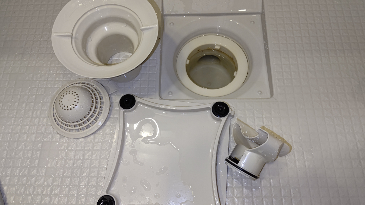 エアコンパーツ洗浄に浴室をお借りしましたゆえ、排水口パーツ洗浄してキレイな状態でお返ししました!