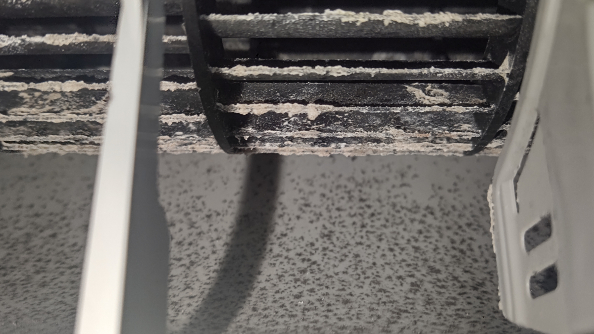 ↑はエアコン内部送風ファンの画像です。夏場エアコン内部は冷たくお部屋は暑くなるので、温度差から結露をうみ、やがてカビが蓄積します。
