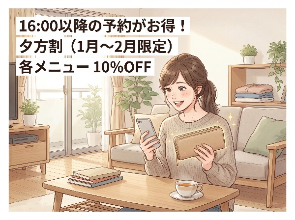 16:00以降のご予約で、各メニューが10%OFF(1月〜2月限定)。 “後回しにしていたこと”を、いちばん動ける夕方に寄せて、家計も気持ちも軽くしませんか。 ご予約は空き枠から順に埋まります。 希望日時がある方は早めのチェックがおすすめです♪