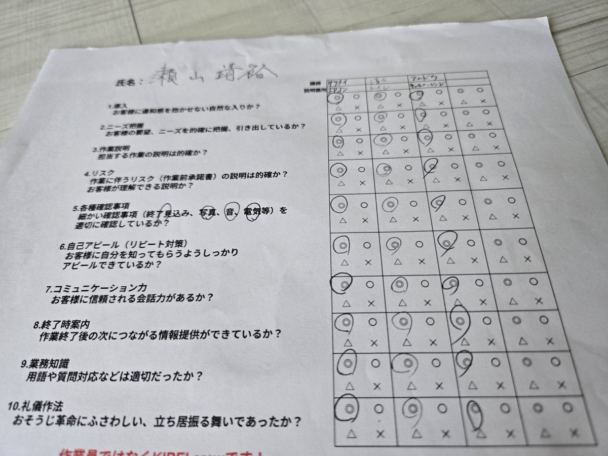 研修生同士がKIREIcrew役とお客様役に分かれ、実際にお客様宅へ入室〜退室するまで一連の流れを行い、それを複数の講師がチェック・評価する研修でした。