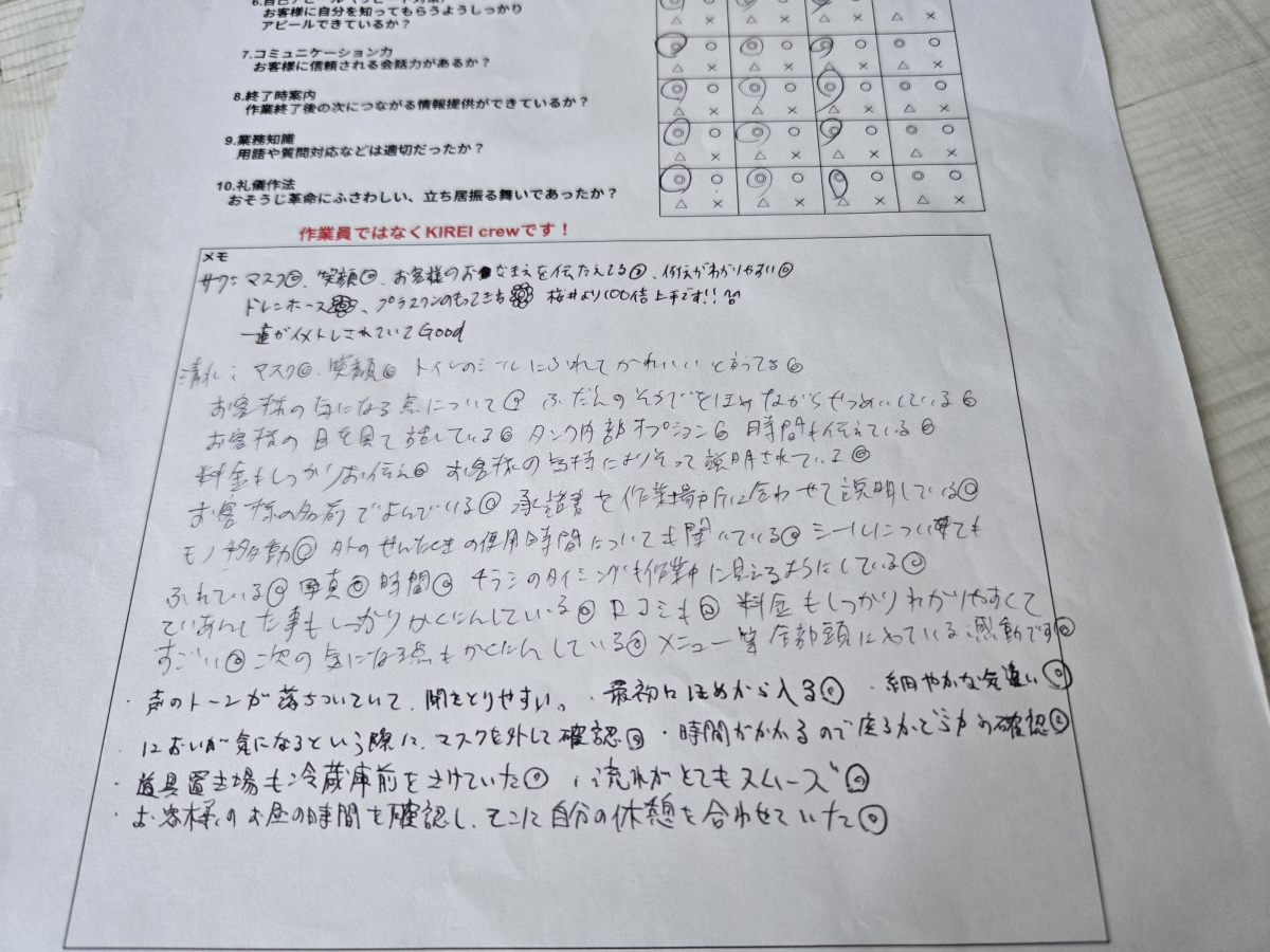 こちらは講師が私のお客様対応に対して良かった点を記載してくれたメモです。