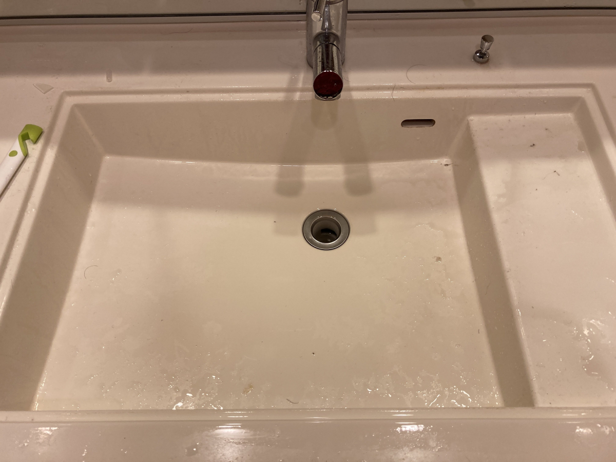 洗面所も写真ではわかりづらいですが、水垢が堆積して模様のようになっておりましたが