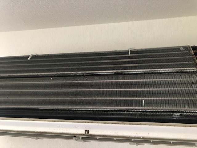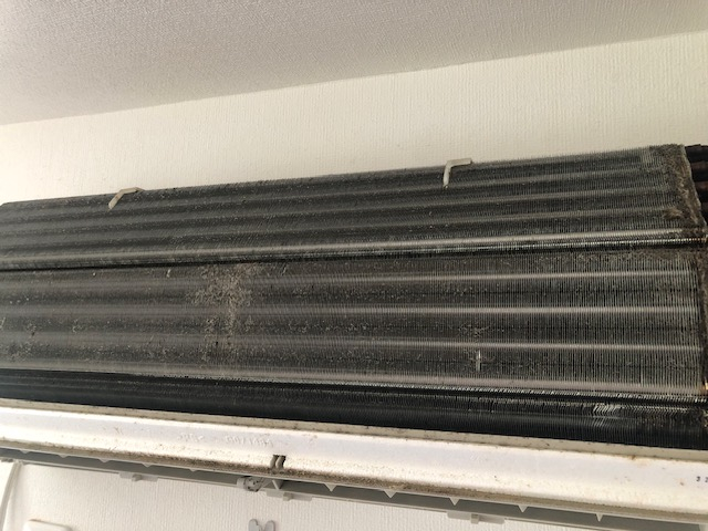 熱交換器がこのように埃だらけだとさすがに能力が低下してしまいます(~_~;)今回は一般エアコンですが、おそうじ機能付きでもクリーニング行わないとここは埃だらけになって電量く消費が多く電気代も無駄に(´;ω;`)