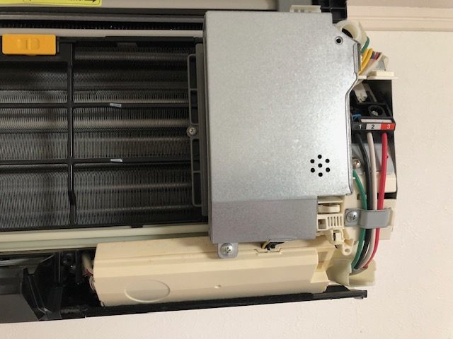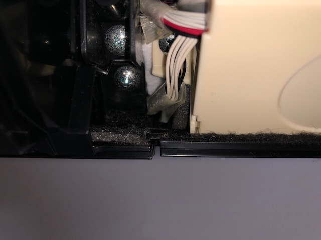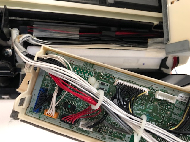 そしてかなり特徴的なのが、基盤の裏に通っている配線を外さなくてはならないので、基盤を一度外さなければならない所です。こんな宙ぶらりんになったら配線がちぎれないように作業するのが、めっちゃ緊張しますね(-_-;)